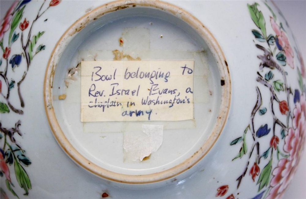 这是一件非常漂亮的雍正白地粉彩双犄牡丹花卉纹碗,在我说见过的当中可以说是最漂亮中的一个。瓷碗的背面有一个老旧的标签,上面写着:“BOWL BELONGING TO REV. ISREAL EVANS, A CHAPLAIN IN WASHINGTON’S ARMY”。REV. ISREAL EVANS是伊斯雷尔·埃文斯牧师,一个在乔治华盛顿将军(1732-1799)军队中的牧师,我们称之为军牧(Chaplain)。看到这碗到代,品相也不错,尤其碗的归属,就拍了下来。虽然有一个小纹,可能也饱经风霜了。在网上google了一下这个碗的来路,最近被另一个拍卖行(STAIR GALLERIES,纽约)拍卖掉的,送了一个邮件到STAIR GALLERIES,被告知这个碗来自纽约的一个私人收藏者以及当事的拍卖价格。拍卖的照片被我查到(见图6,最后一张),这次拍卖时标签下面的一个小纸条被拿掉,可能是拍卖时的号码。从图可知是同一个碗。所以除了上面的标签以外,其他的信息就没有了,好像网上同时还有一件瓷器也有这个类似标签被拍卖过,但已查不到照片及信息了。