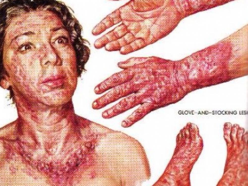 糙皮病的经典症状被描述为四个D,即英文diarhrea(腹泻)、dermatitis(皮炎)、dementia(痴呆)和death(死亡)。