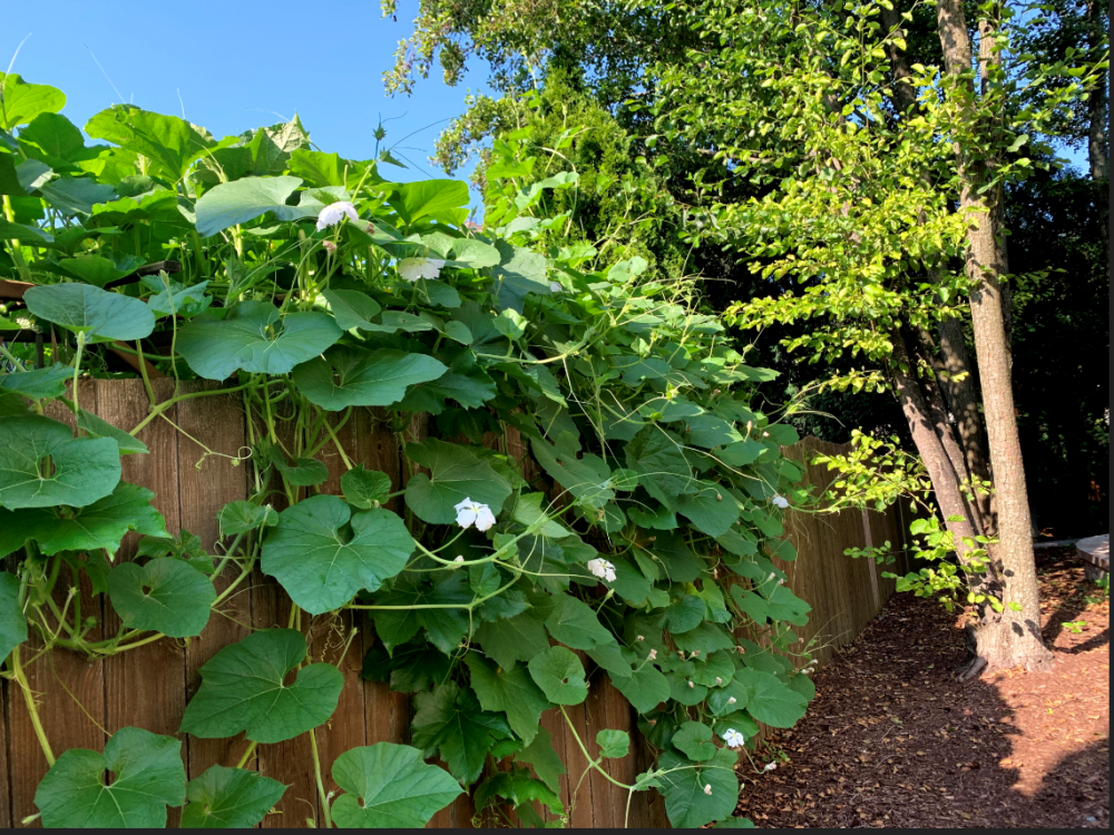 然后葫芦娃开始爬藤爬疯了。先是翻墙,跑后院邻居家了。跑过去将在地上蔓延的枝叶剪了,还意外看到了一个出墙的葫芦。
