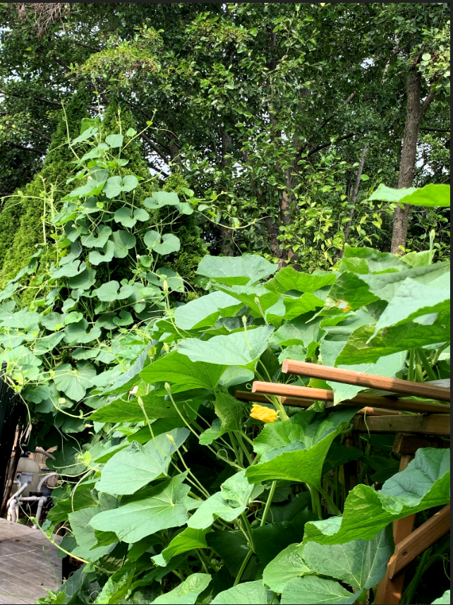 那时的葫芦还比较低调,藏在绿叶中。以至于大儿子7月15日回家时,我们也没看到一个大的。等到儿子回到波士顿第四天,我们收获了第一个葫芦。