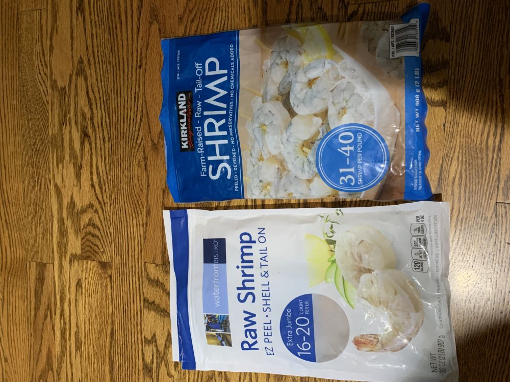 在冷冻柜找到了领导在Jewel 买的带壳的虾,还剩几个,加上另一包我在Costco 买的去壳虾,也还有几个,凑一起也有一盘了。