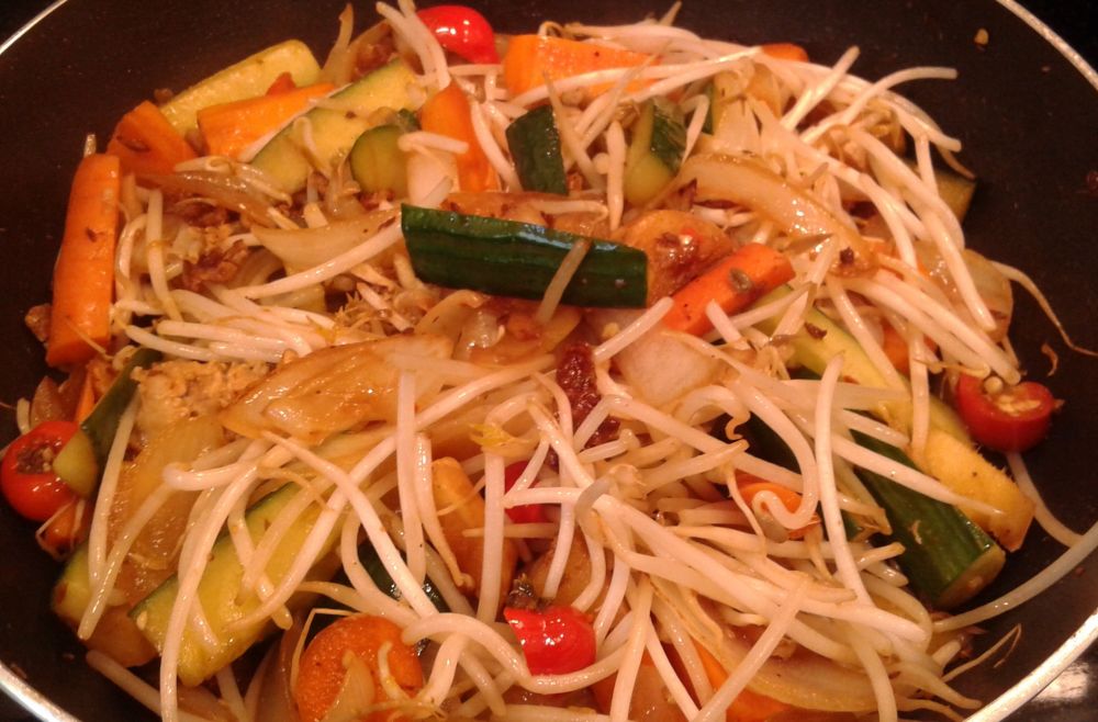 家乡人特爱吃姜炒鸡, 我也喜欢, 昨天做了一小碗, 今天用剩下的鸡肉再加很多姜,红罗卜,黄瓜,洋葱,辣椒,豆牙炒了一大锅, 够我一个人吃3顿了:) 这不是正餐哈, 今晚我们吃trout, 家长吃他百日不变的沙拉: sweet kale mix.