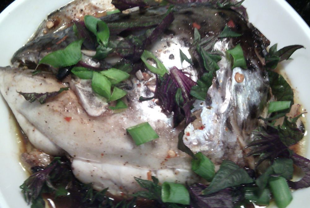 他到厅里看球赛, 我从锅里端出热腾腾的极品鱼头, 撒点酱油葱花紫苏橄榄油, 幸福的享受了半个鱼头后, 不争气的胃竟然饱了.