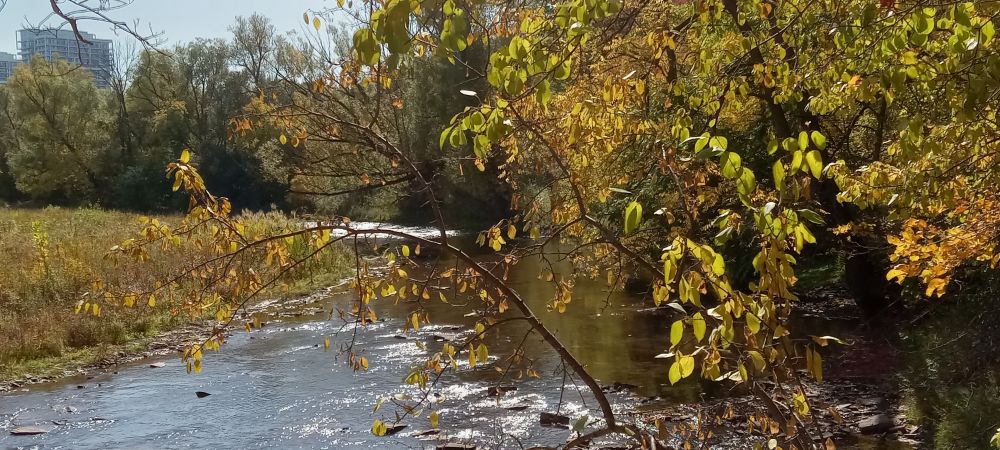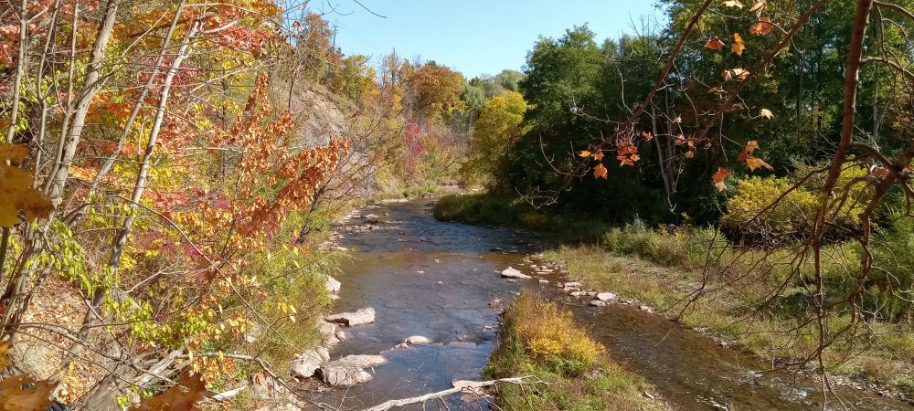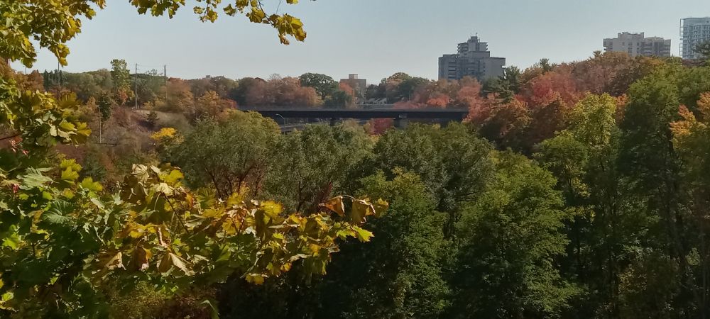 走到QEW桥下,从铁丝网洞里往上游拍了一张: