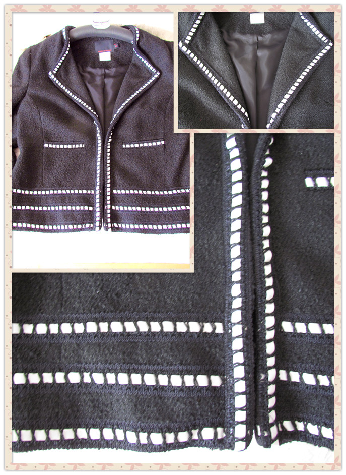 2,Debbie Shuchat是加拿大高瑞女装设计师以个人名字打造的品牌。该款夹克用的是涤毛混纺粗呢面料。领口,袖口,前襟和下摆都有黑白镂空缎带作装饰,勾勒线条,营造精致品味。该款是以Chanel boucle 夹克为样本,庄重优雅。与之相配,我用同样黑白两色,上为飘逸绣花衬衫,下为简约西服裙,使整体协调一致,典雅高瑞。