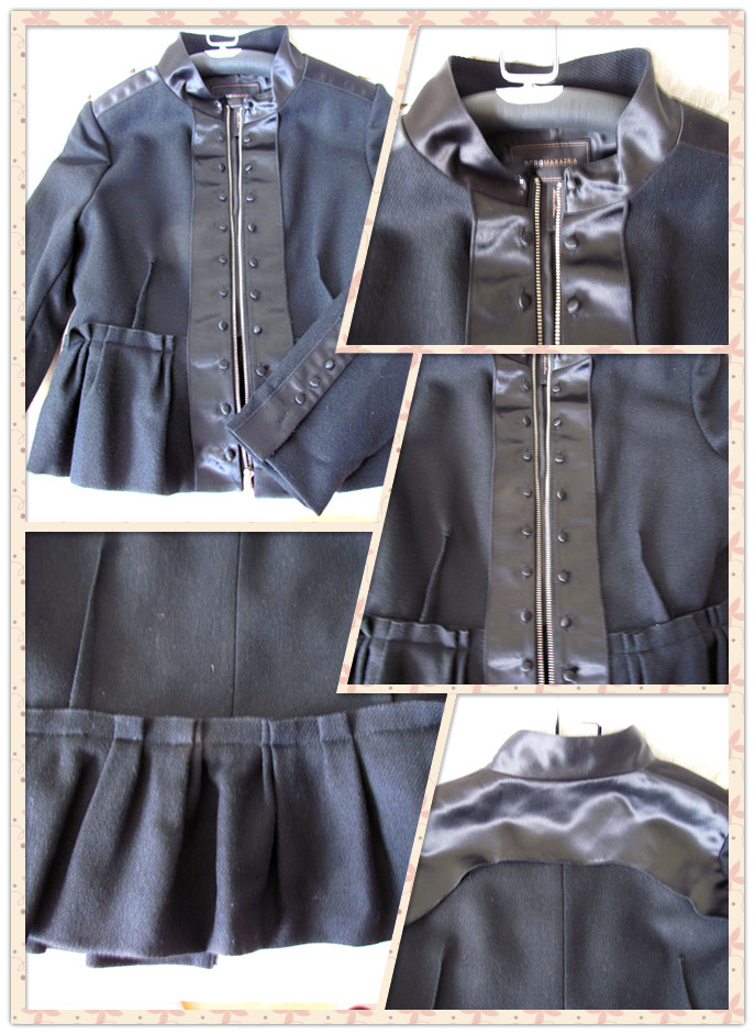 4,BCBG 是美国创办人Max Azria新成就的世界品牌。该款夹克也是纯羊毛面料,斜纹粗呢,有绸缎作装饰。立领和前襟的包扣,增添了东方文化的韵味。裙式下摆的设计,又显俏皮。该款特点随意活泼,搭上紧身靴裤,休闲自然。