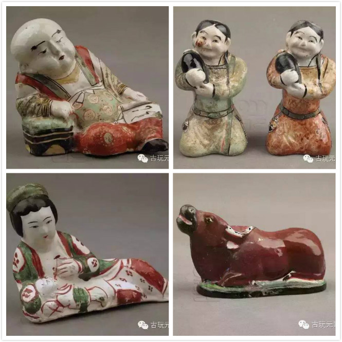 这种红绿黄彩器,在以前是被认为‘宋加彩’。金代墓葬的考古发现,才使其年代有所纠正,如河北磁州窑,河南禹县扒村窑,山西长治窑和山东淄博窑出土了数件白釉碗,碗内饰以红黄绿等彩色标本。一般来说,釉上五彩瓷器是二次烧造,在白釉瓷面上,以红黄紫绿蓝(或釉下青花)等色彩描绘,有的少于五种色彩或多于五彩。根据古玩元素网的文章〈五彩瓷的源起-红绿彩〉,金代瓷俑(图3和图4),除红黄绿彩外,眼,眉,帽,鞋等部位加饰黑彩,为历来所未见,故形成了金代是五彩器的起源一说。