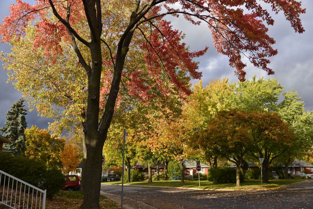 住家附近就那么几棵树,但秋季早中晚和阴雨阳晴的光线变化,仍然让周围的景致很有魅力,下面几句小词,是暂去不了远处观秋的我所感。