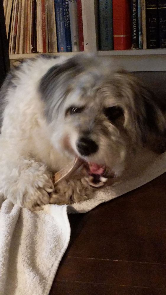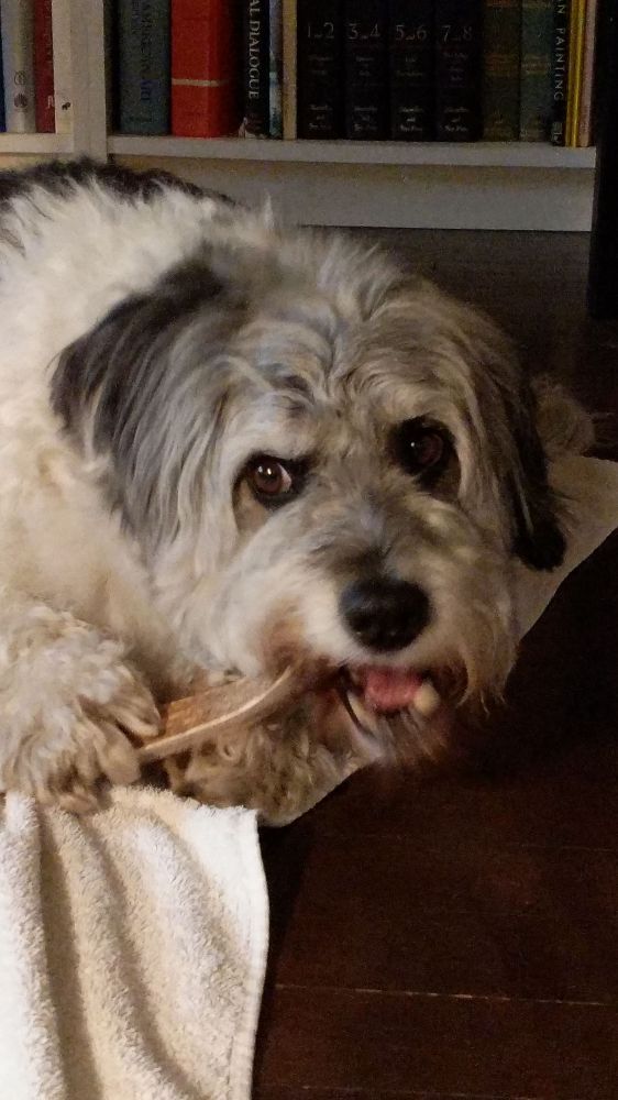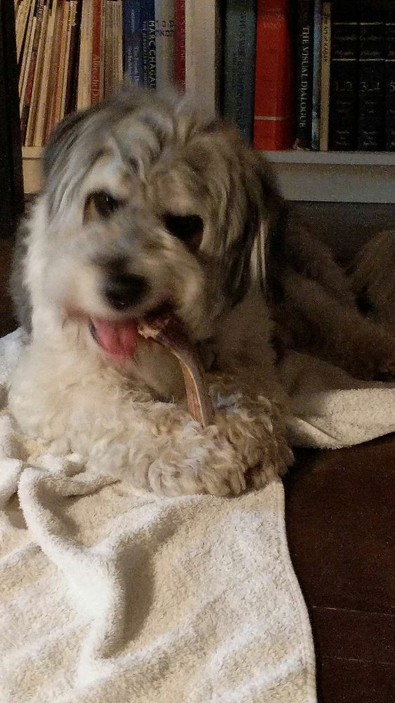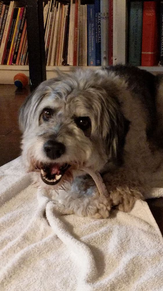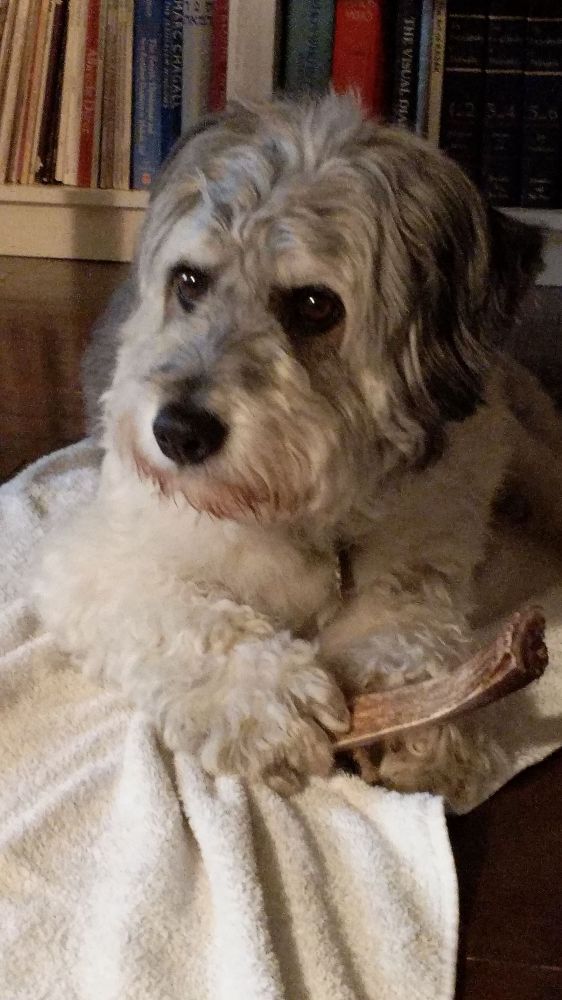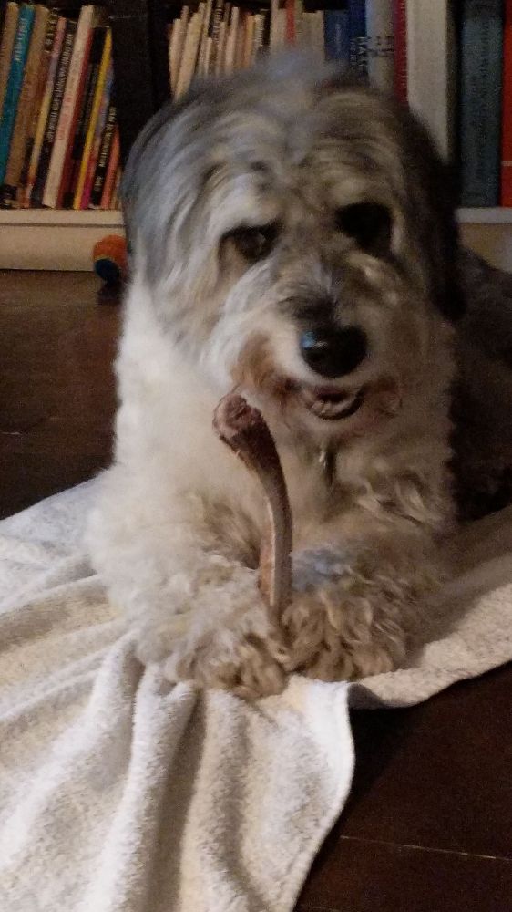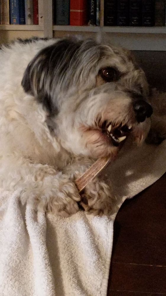 Coco:嗨嗨,偶的衣服档次低,手中的骨头高大上(Co啃的是鹿角,是第一次啃)!