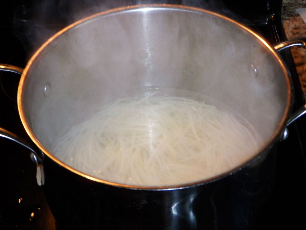 2.把葱也切成细丝。 3.水烧开,放土豆丝,这是不要离开,因为要快,当土豆丝断生就可以捞起,不然土豆丝就变软了。