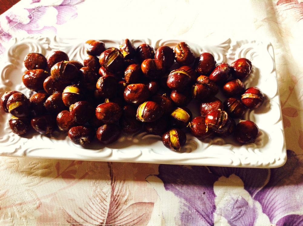 6.栗子入烤箱20分钟左右,取出栗子,用毛刷把桂花糖水刷在栗子表面,边刷边翻动.刷好糖水的栗子,继续入烤箱烤制5分钟,取出翻一下,又烤4 到5分钟,再翻一下, 又烤至糖水变干就可以了。