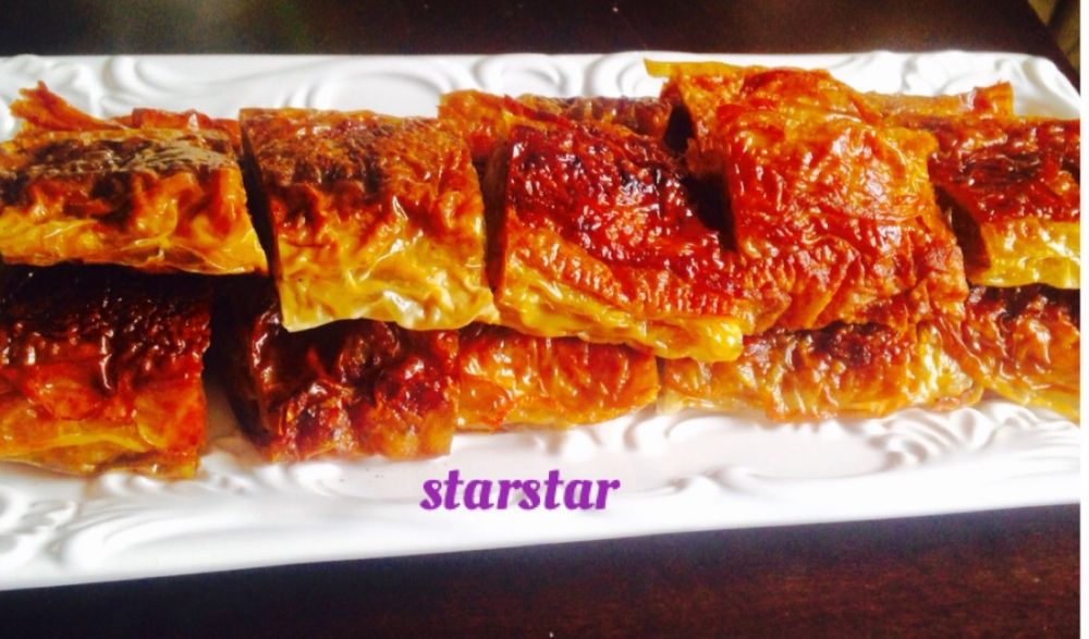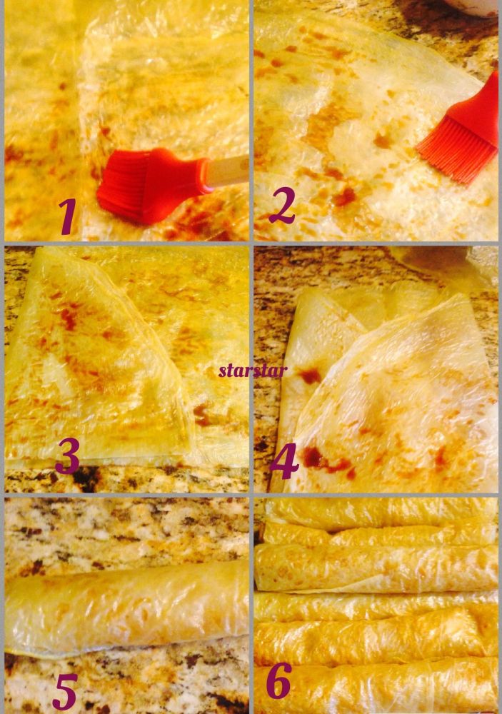 2、如图:豆皮摊开,用刷子蘸上调汁,均匀地把调汁刷在一半的豆皮上,不用刷满整张豆皮。然后把没刷汁的一半豆皮叠在刷了汁的那半边豆皮上。用刷子又蘸上调汁,在叠好的豆皮刷上调汁。然后如图把豆皮的一边叠至豆皮的三分之一处,把叠过来的那片没有刷上调汁的豆皮边刷上调汁,把另一边豆皮叠过来如图重叠在刷了汁的豆皮边,然后在上面刷调汁。现在就可以把豆皮卷成长形了。把每张豆皮都卷好,接口朝下放在盘里。