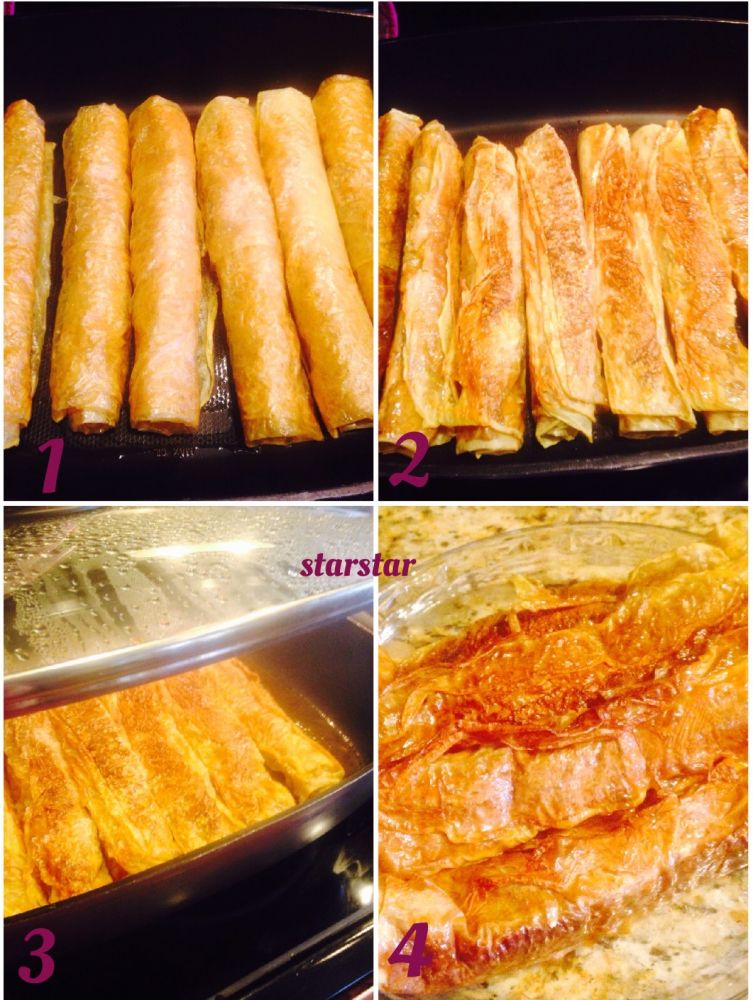 3. 把卷好的豆皮用油把两面稍稍煎成金黄后留在锅里。先煎有接口的那面,然后翻面,煎黄另一面。