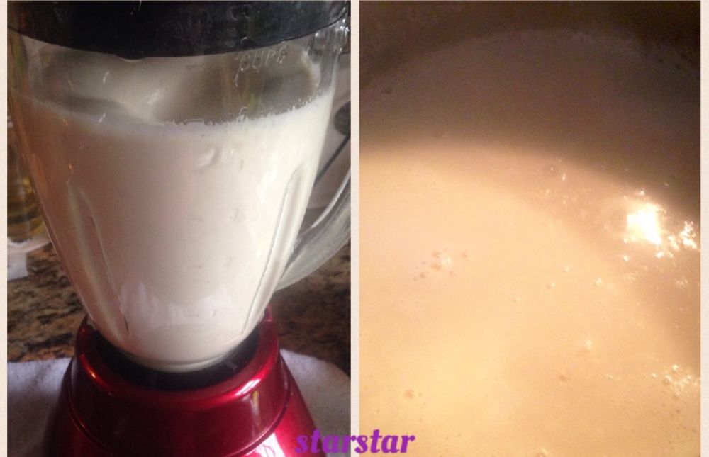 1。把黄豆泡过夜。将泡好的黄豆,用清水冲洗后,沥去水。取一半黄豆,加两杯水用粉碎机打碎,用纱布隔去渣留汁,豆渣再加1杯水打1分钟隔去渣留汁。另一份黄豆如上操作,豆浆就做好了。