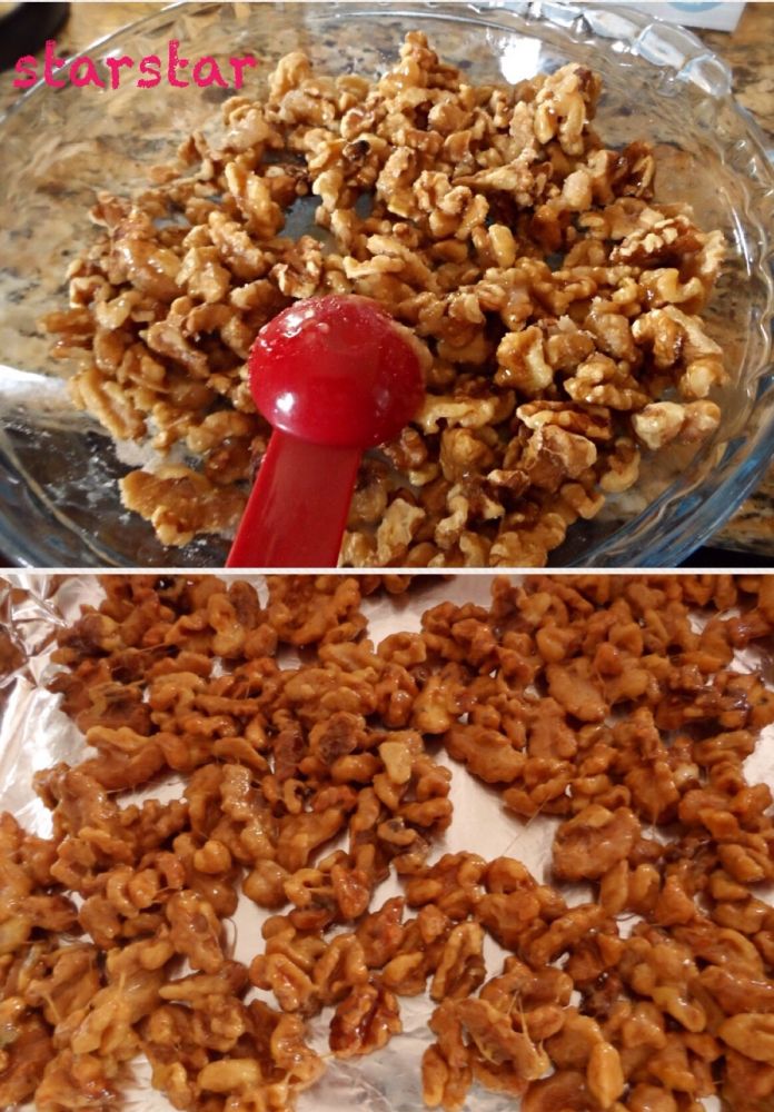 1. 把核桃仁,白糖,蜂蜜,syrup,盐混合均匀 (注:这时不要加入baking soda,放在一旁待用)。