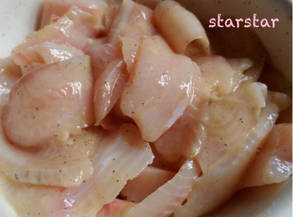 1,在大碗里将切好的tilapia薄鱼片和一小撮盐,一小勺料酒、两大勺淀粉、半小勺胡椒粉,并打入一个鸡蛋后,拌匀,放置20-30分钟左右。