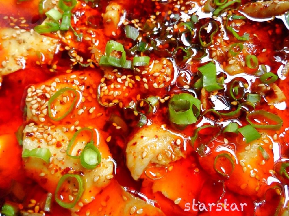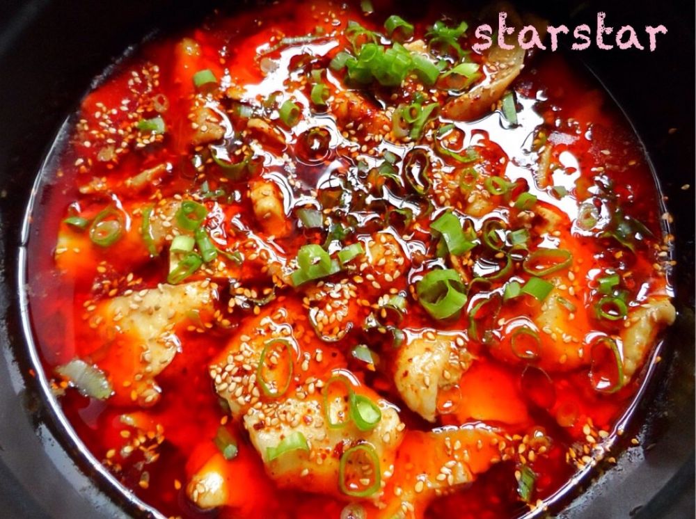 4,将煮好的鱼肉连汤汁倒在煮好的豆腐上面。现在的大腕里,豆腐在最下面,鱼肉在最上面。然后在鱼肉上面用大勺子浇上4-6大勺辣椒油(辣椒油是那种油和辣椒面都混在一起那种,我的辣椒油做法附在下面)和4 大勺花椒油 (花椒油的做法和辣椒油类似,不过这个只取上面的那层油),最后撒上葱和少许芝麻即可。