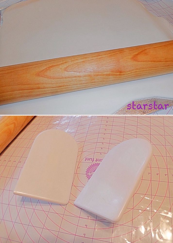 1,把fondant擀薄,然后切割出四条长一点的fondant条做蝴蝶边和下面的彩带,短一点的fondant条做中心那个结。