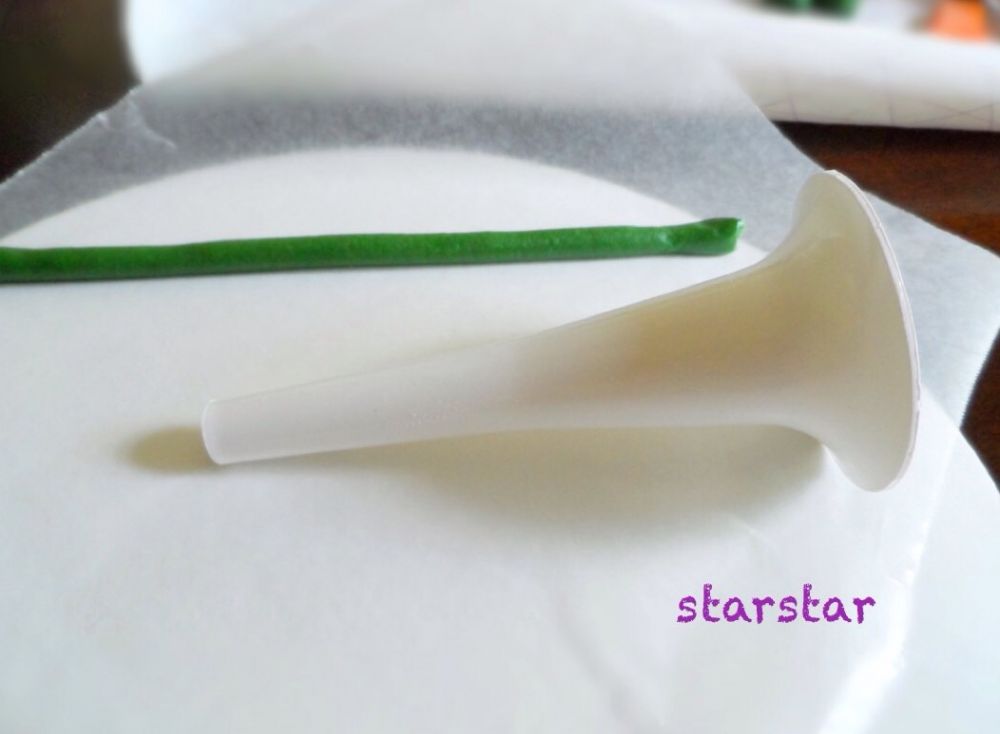 我是第一次用fondant做花茎,在网上找到的信息是用专门的extruder挤出花茎。因为时间紧,买一个喜欢的extruder来不及了。我又是灵机一动,找到了kitchenaid做sausage的一个最小的漏斗附件(还从来没有用过呢,想不到用在了这里),把这个小漏斗当成一个手动extruder。我把一小团fondant放进漏斗里,用手把fondant从漏斗里挤出来,花茎就做出来了!挤出来的花茎可以用手轻轻搓动或者拉长一下让花茎变得更细一点。做出的花茎稍稍晒干一下就可以用了。
