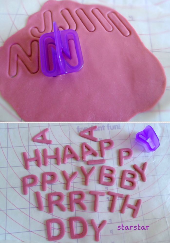 把fondant擀薄,用字母cutter切出想要的字,然后晒干就可以了。这是我第一次用Wilton的这一套字母cutter。因为心里没数,所以每个字都多做了一两个。谁知效果很好,这套工具也很好用,喜欢!