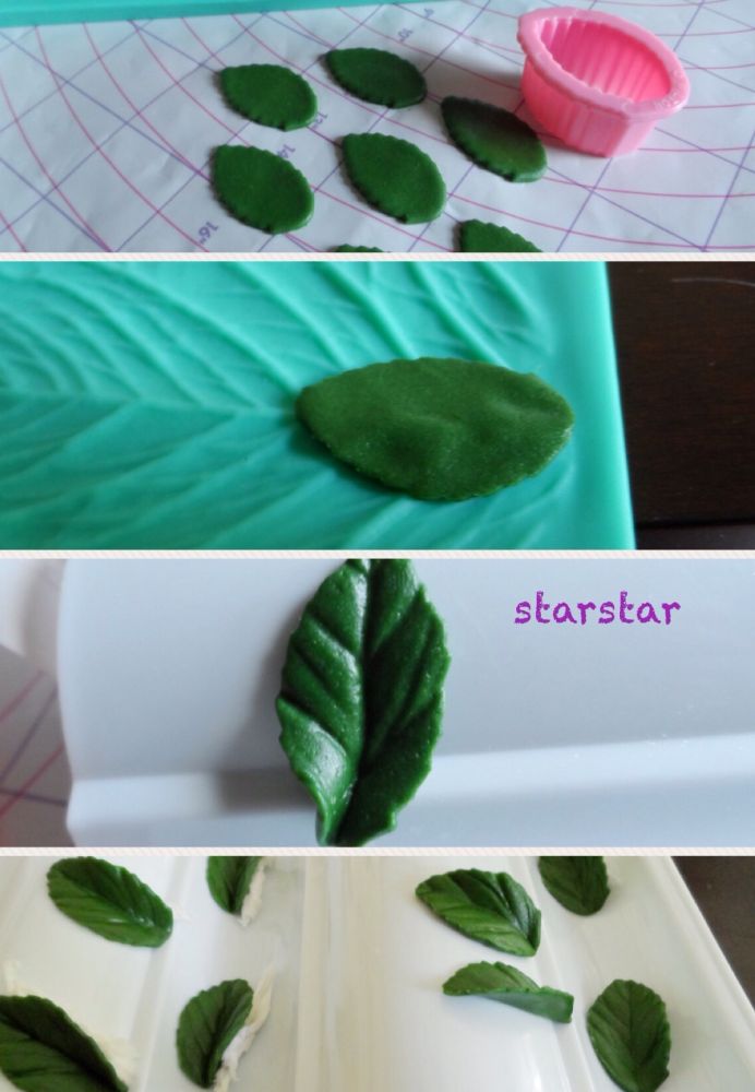 1,把fondant擀薄,然后用叶片cutter切出很多叶片出来。