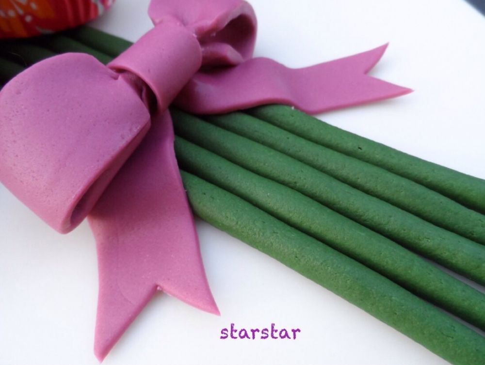 我把盖蛋糕盘剩下的白色fondant分成了两部分,分别染成了紫红色和绿色。紫红色的fondant用来做玫瑰花束上的蝴蝶结还有生日卡上的字。绿色的fondant用来制作玫瑰花叶和花茎。