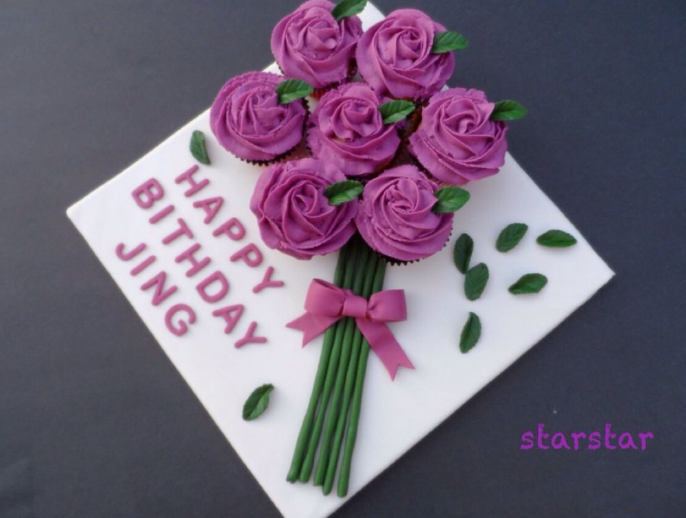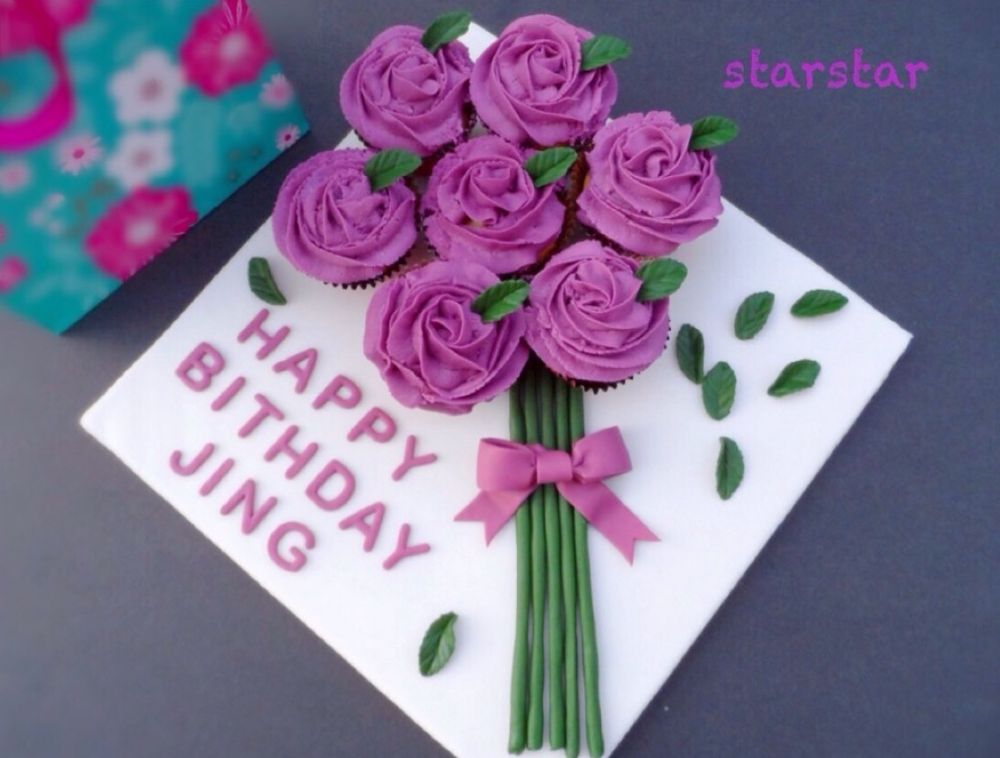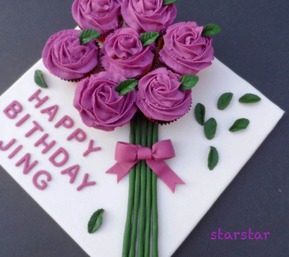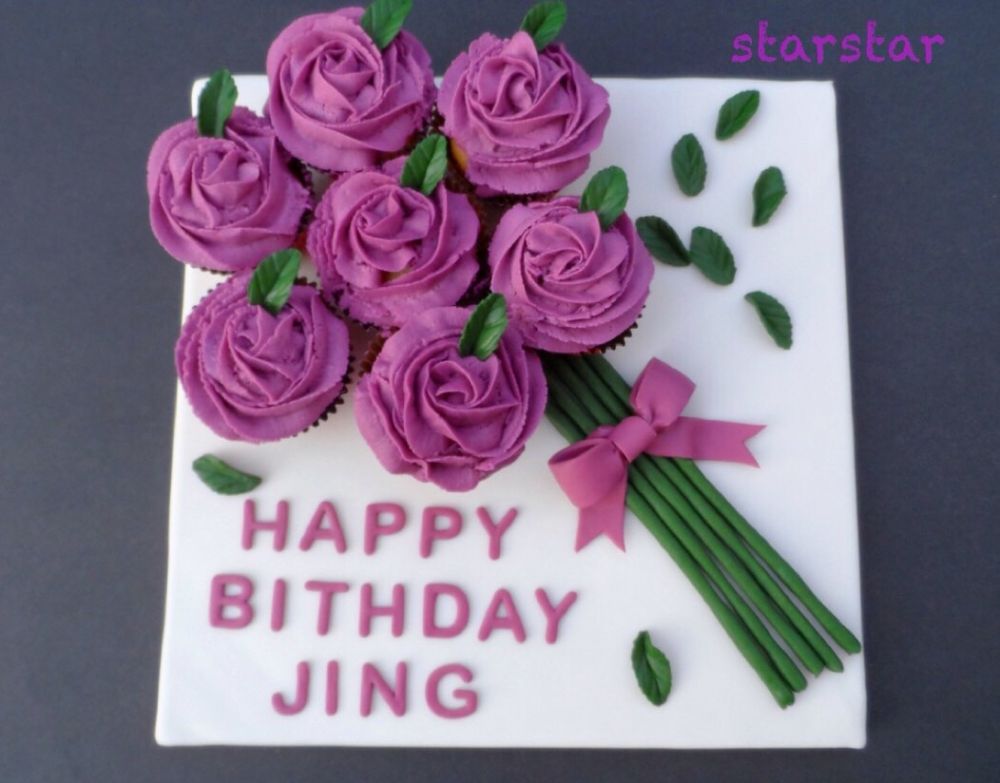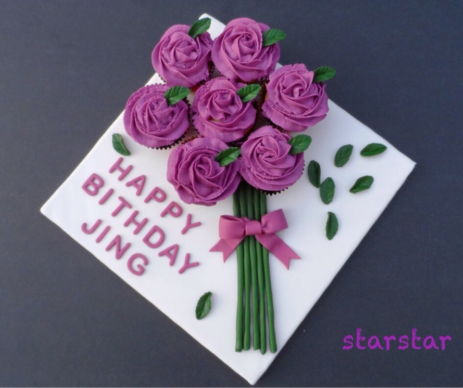 最后组装时,我在每个杯子蛋糕下面都挤了一点icing来固定蛋糕的。而fondant做的花茎/字/蝴蝶结等,我是涂了一点水固定的,也可以用一点点icing来固定。