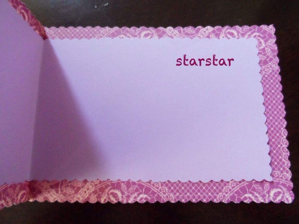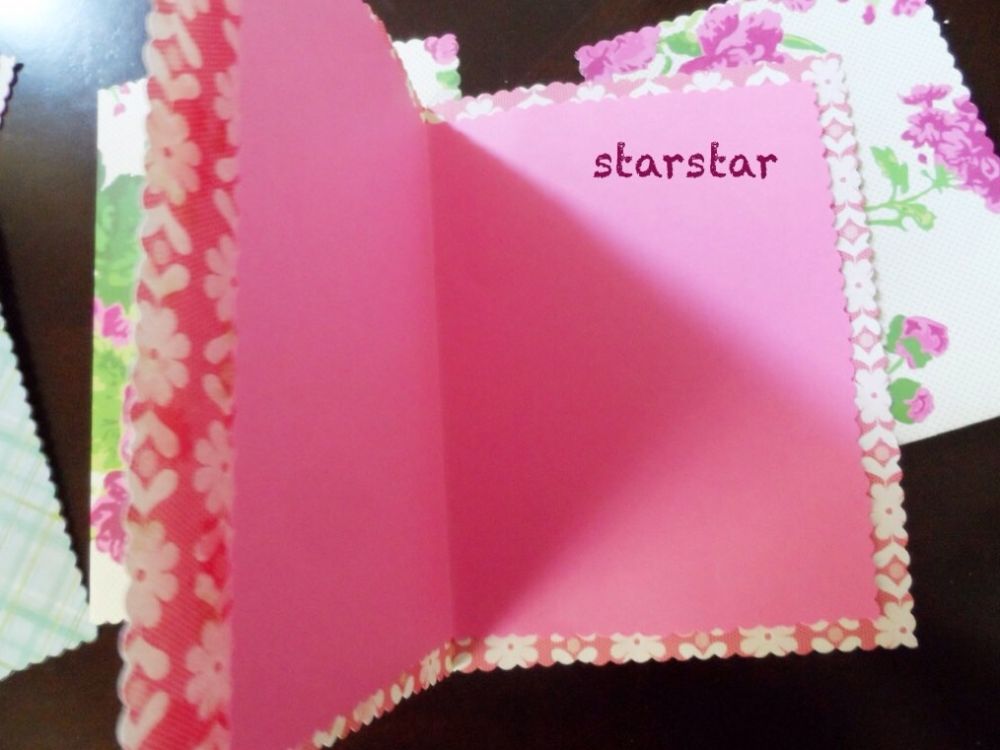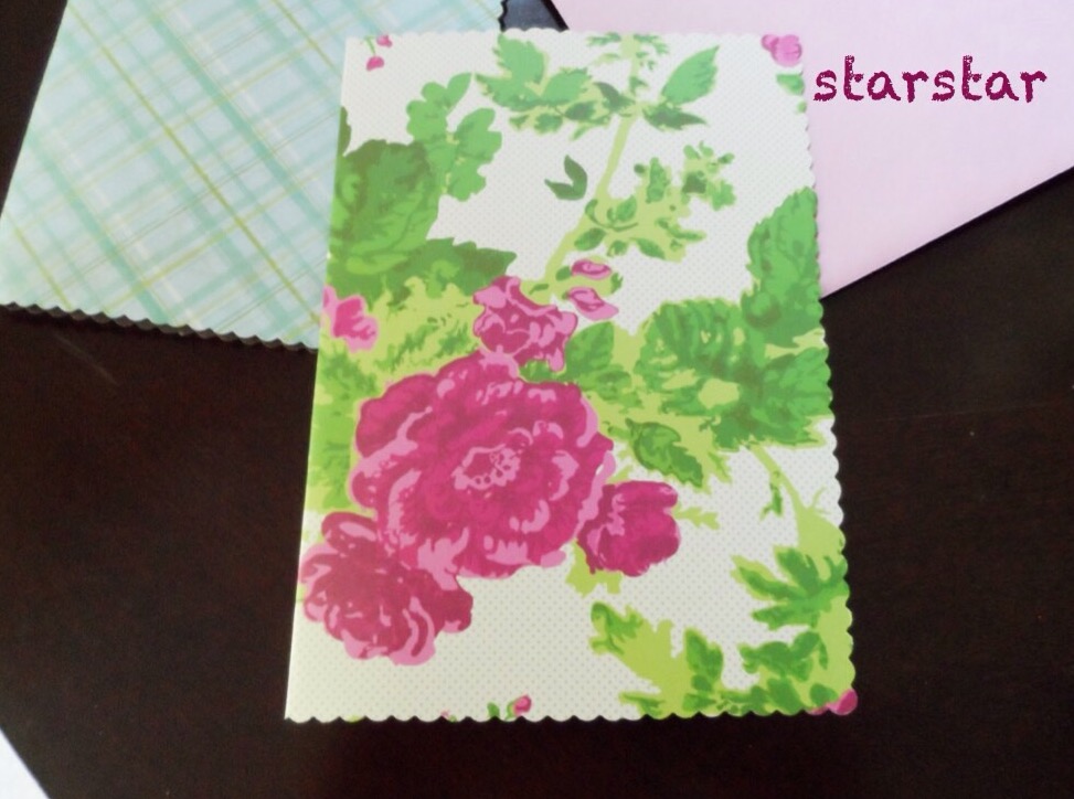 那天给妹妹准备给朋友的生日礼物时,灵机一动,用家里的彩纸做了很多卡片。如果您也有这样的彩纸,还有剪花边的那种剪刀,这种卡片真的太好做了。先找两张您喜欢的, 而且颜色搭配和谐的彩纸,然后用剪花边的剪刀把纸边剪出花边,记住里面夹层的那张彩纸要比外面那张小一点。最后把剪好的两张纸从中心对折一下,然后沿着中心对折的那条线把两张纸沾在一起就可以了。