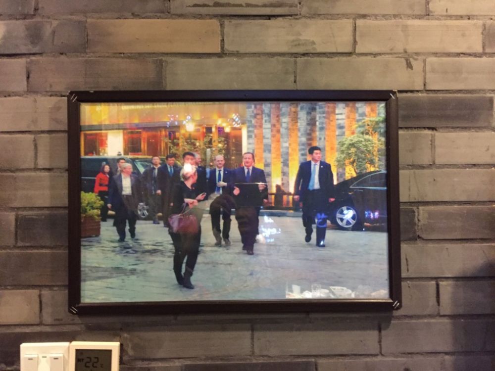 晚上是朋友请我们在成都会展中心的香天下火锅店吃饭。为啥要去那里呢?朋友说那里现在是成都最出名的火锅店,因为英国前首相卡梅隆来成都访问时候,就是在那里的一间包厢里吃的火锅。现在卡梅隆吃的那个包厢有个最响亮的别名:首相包厢。这次朋友专门为我们订了这个包厢。我们开玩笑说,这个卡梅隆呀,搞脱欧公投搞砸了,英镑一直往下跌,可让俺们生气啦!哈哈哈。。