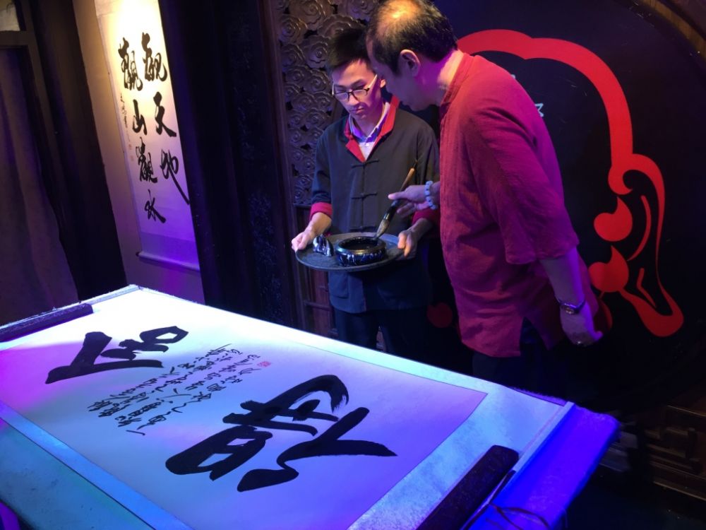演出完了,请一位书法大师杨晗方上台写字: