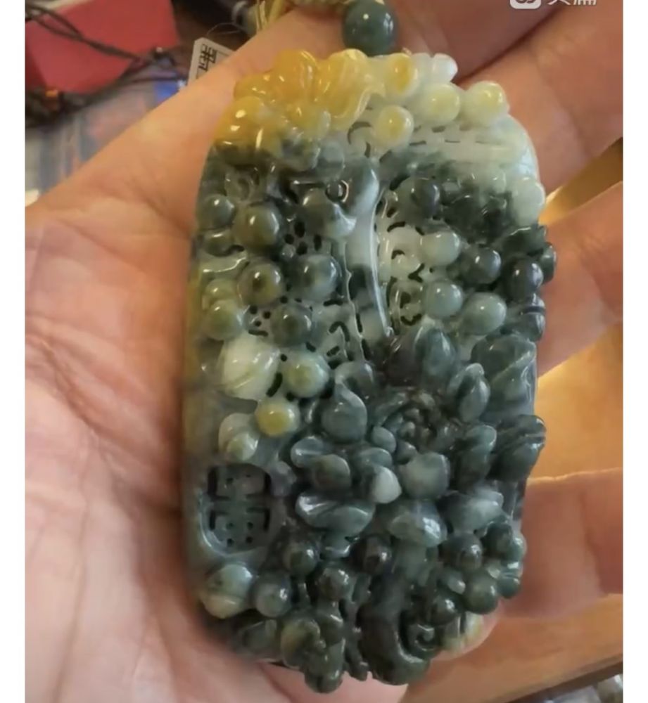你看这满牌的花枝与花苞,每一颗圆珠饱满莹润,每一片花瓣玲珑有致,深浅翠色层层晕染,顶部一抹暖黄如朝日轻染,浓淡错落,灵气自生。镂空细雕的枝蔓缠绕其间,繁而不乱,密而不堵,明明雕得这般繁复精细,却半点不显匠俗刻意。