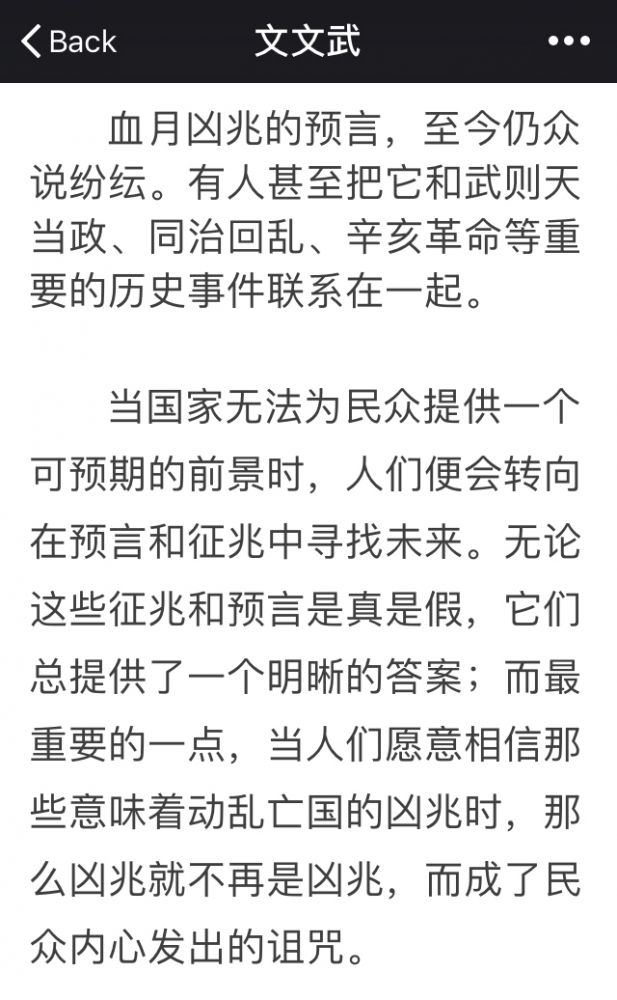 大批网民的结论如下: “可见,历史记载的血月预示都属于凶兆。”至本文发表时, 所有在微信和网上的有关血月文章, 都已被或正在被删除, 幸亏本人保留了原文档案。