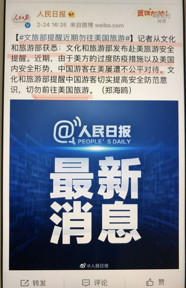 2月24日下午, 中国顶级官媒<人民日报> 突然发布中国政府的安全提醒: 特别提到美方过度的防疫措施, 美国国内的安全形势, 以及中国游客屡遭不公平的对待,并呼吁中国游客切勿前往美国旅游。众所周知, 大部分中美航线已经停航, 美国也禁止来自中国疫区的外国人入境多日。此外, 中国国内的大多数城市已经封区封路, 无法出行。显而易见, 这个安全提醒, 并不完全适合国内的广大民众, 而是祖国的用心安排, 特事特办, 启用非寻常的方式呼吁在美的海外华人。本通告充分体现了党和政府对广大海外侨胞, 留学生和在美华人的真诚关心和爱护。希望广大侨胞奔走相告, 认真考虑目前的危险处境, 并紧紧依靠祖国, 尽速找到解决的出路或方案。