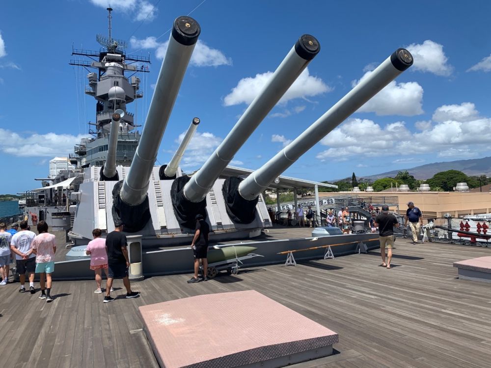 我们似乎在佩洛西参观珍珠港纪念馆及战舰的次日到访军营。这里人山人海,当日极少见到华人,幸运的是两位舰上导游都讲中文。原来几周前,航母和多国军舰已出海军演。我们看到了日军起初的骄横,狂野及最后的惨败。在举行日军投降仪式的甲板上,久久不愿离去。导游说,当年的投降地点开始有争议,但最后选择到了密苏里号战舰。当年周围有几百艘战舰,几十部潜水艇和数千架飞机戒备。正所谓“敌人不投降,就叫他灭亡” 。他们深知,日本的野心是利用日人为内应,占领整个珍珠港。然后以夏威夷作为战略跳板,进攻加尼福尼亚,拟东进直逼华盛顿,完成“人类命运共同体”的美梦,让专制独裁体制彻底统治全人类。珍珠港即是旧日本美梦破碎的地方。如今的日本脱胎换骨,成为了文明世界的一员,重新受到了世人的尊重。