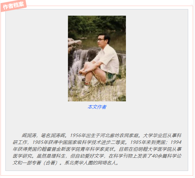 阎润涛一只眼睛几乎失明,听力几尽失聪。2004年开始在文学城发表博文,现在在博客里有961篇博客文章,还有2004年-2006年的上百篇博客下架,因为已经出版成书,所以博客文章总数约为1100多篇。总计点量约为2500万多点,在文学城有粉丝万人。他的业余时间的大部分都在写博客和陪伴着网友。