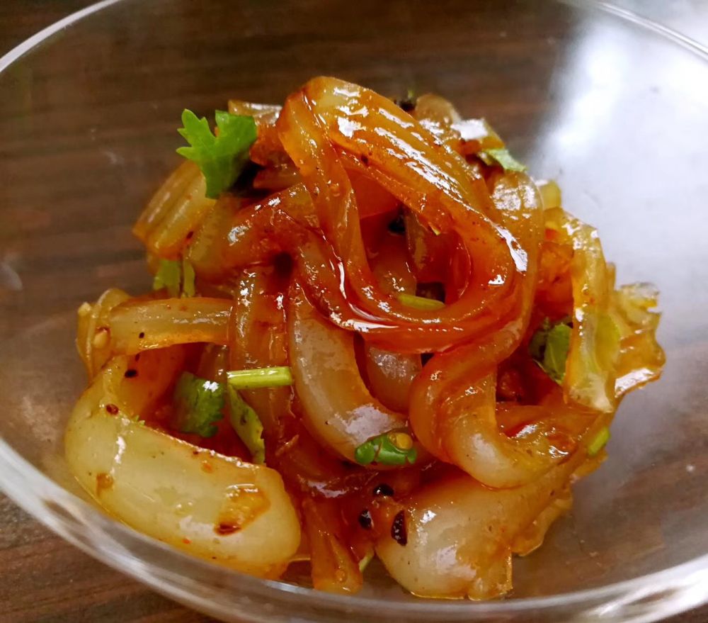 小锅里放葱姜蒜油炸5分钟,过滤,浇辣椒粉里,酱油,醋调味