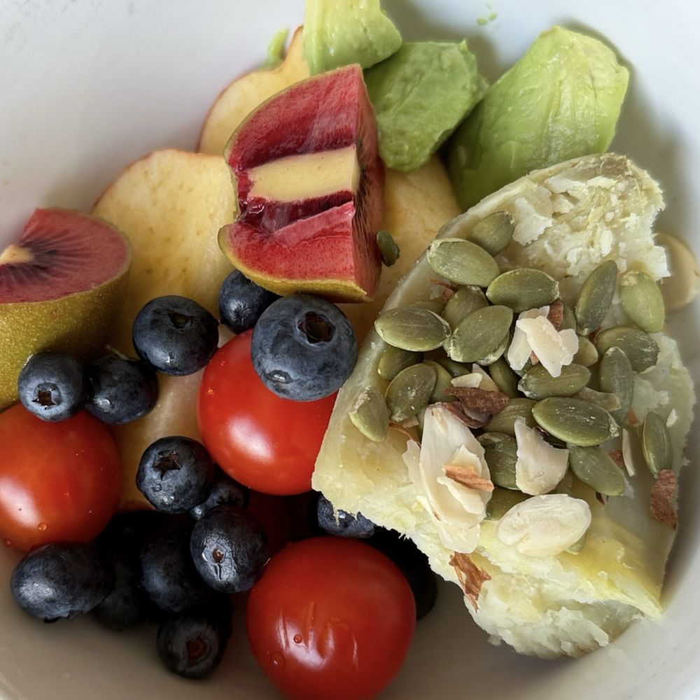 忘了放半根香蕉,有半个苹果,四个cherry tomatoes,一把蓝莓,半个红宝石kiwi连皮吃,1/4个牛油果,一小块山芋,一把生南瓜籽,生杏仁片。五种颜色和植物蛋白都有了,还可以加毛豆,植物蛋白就更高了,吃完很满足,不觉得饿。