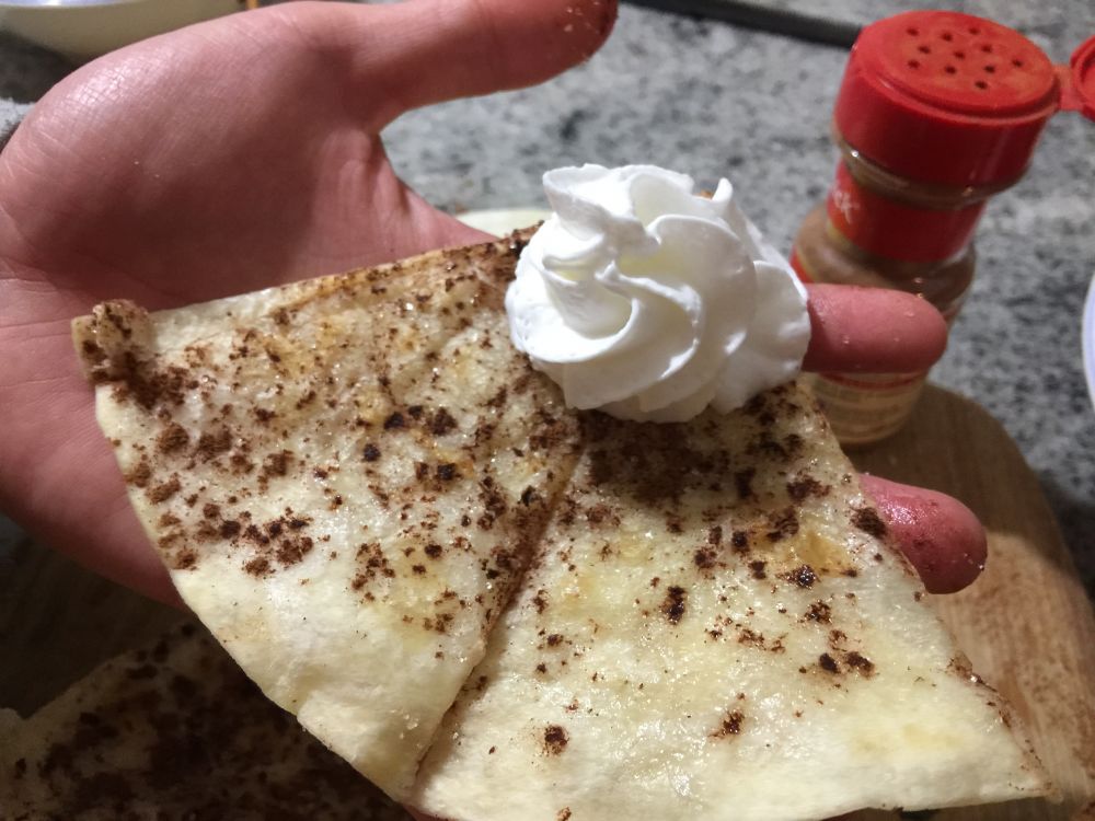 超市里买的Tortilla 面饼,锅加热中高温,放块黄油或猪油,面饼煎至金黄翻面,等另一面变色后拿出洒糖、桂皮粉和鲜奶油,兄妹俩一人吃两张。