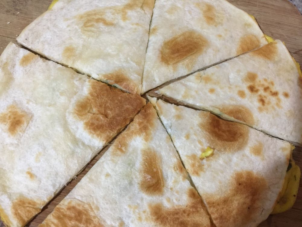 热锅放油,鸡蛋打散洒葱花香菜盐,用勺将蛋液涂饼上,(喜欢奶酪的洒一圈奶酪),上盖一张饼,一面金黄脆后再翻面,大人小孩都喜欢吃。