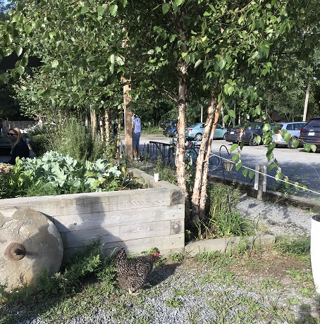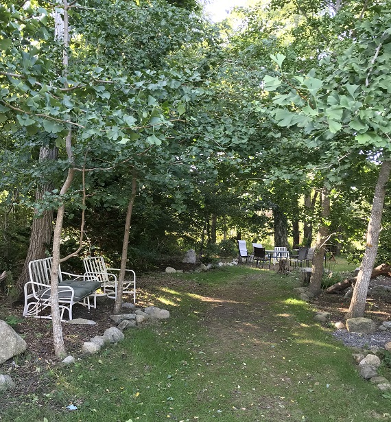 那个小红房子是鸡舍。回转身,是几棵银杏,树荫深处是简陋的桌椅