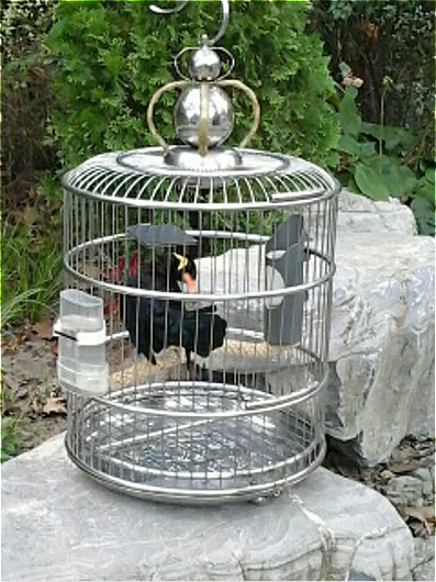 一块由大自然随意切割的山石上,精致的鸟笼在歌声鼎飞中静静地竖立着。一身黑丝绒的华袍,雍雅,金光铮亮,鹅黄色的尖啄伸出如打造出的水晶体透亮,圆铮铮的脑袋上两片金灿灿的布衣相嵌在骨溜溜的眼睛后面正显了一幅美画如娇。我说:“哦,好漂亮的鹩哥会说话吧”,主人得意地点点头。无论我怎么引诱,她的小脑袋左甩右晃的摆动着,一幅打量着我这个何方神圣大家闺秀的架势,巧嘴紧闭。主人问她:“你今天为什么不说话啊?”她马上小嘴一蹶“要吃生活了!”(意即挨揍)弄得我们惊讶不异。“小姐真漂亮!”接着在主人的引领下她金口大开,“早饭吃过吗?”,“身体健康”,“恭喜发财”,突然她话峰一转“东方明珠去过伐?”我一时被她逗得哈哈大笑。接着她普通话、英语、唐诗滔滔不绝,她说话语音清晰,语调优美,甜津津的好象她的肚子里装了按纽,无论什么词一触即成,我则被她萌得前仰后翻。