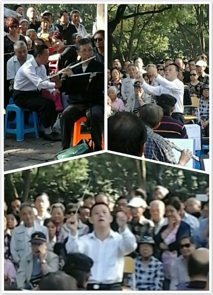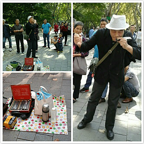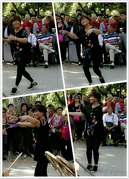 公园里的老艺人书法和画画描在扇面上的艺术就是江南又一情调了,我买了来送给外国同事。老少同礼,内外无欺,站在我旁边的外国友人也买了几把一个价。相信外国朋友一定是会欣赏中国扇面艺术了,他们手握纸扇拉着老人开心的合影。