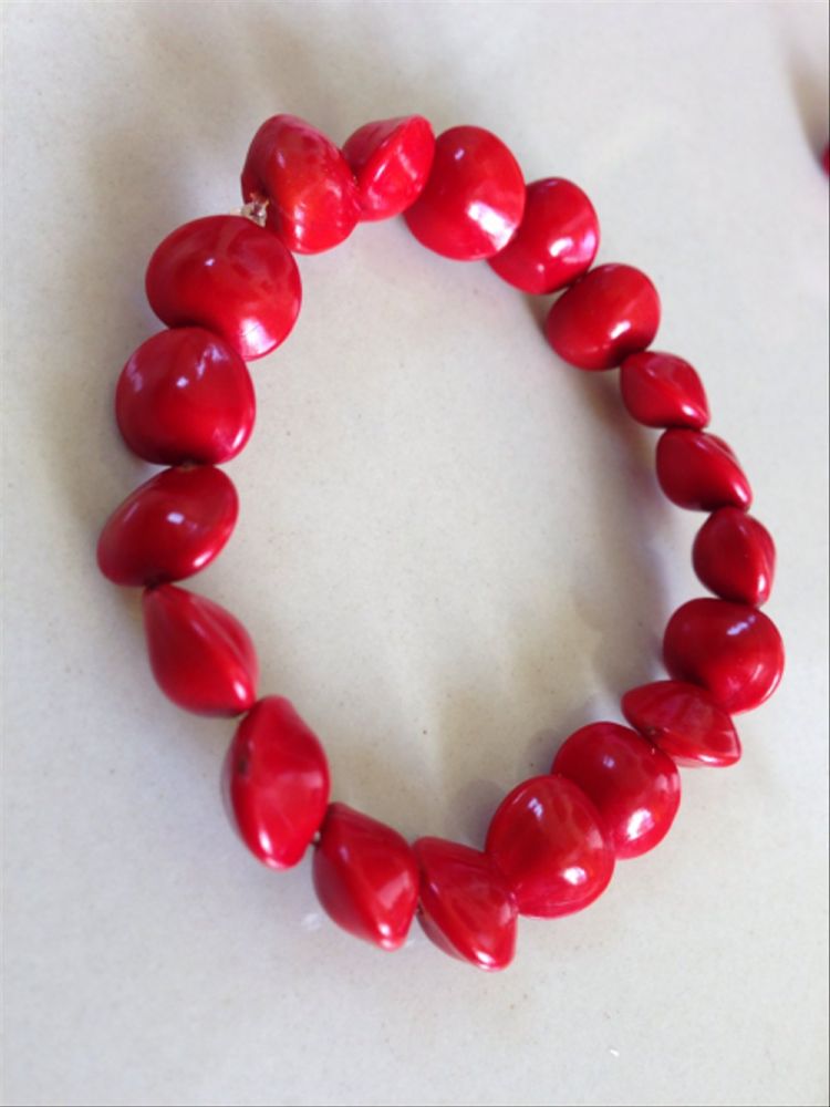 不是圆的,而是浪漫的心型。浑身正红,光泽照人,和情人节上那个非常相似。女孩子会捡来很多,挑出最漂亮的,用线串起来,戴在手腕上。好看。