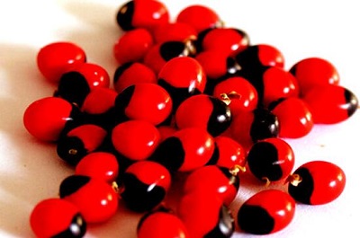 那么,王维老师所说的红豆,是什么样儿的呢?肯定不是我们吃的那种赤豆,而确实是相思豆。问题又来了。岭南一带,还有海南,普遍生长的红豆(相思豆),确实像一个豆子,圆圆的一粒。红色的,有个黑色的斑块。和做豆沙的赤豆有点儿像: