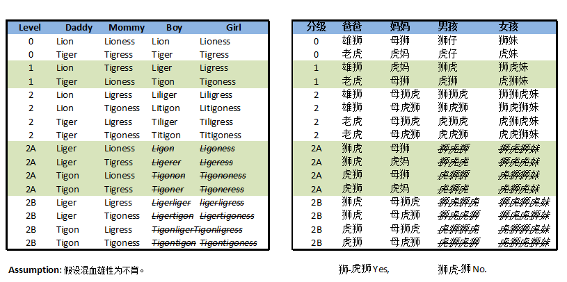 狮子,Lion,遇到母老虎,Tigress, 跨婚,有了混血小宝宝,叫 狮虎。Liger。