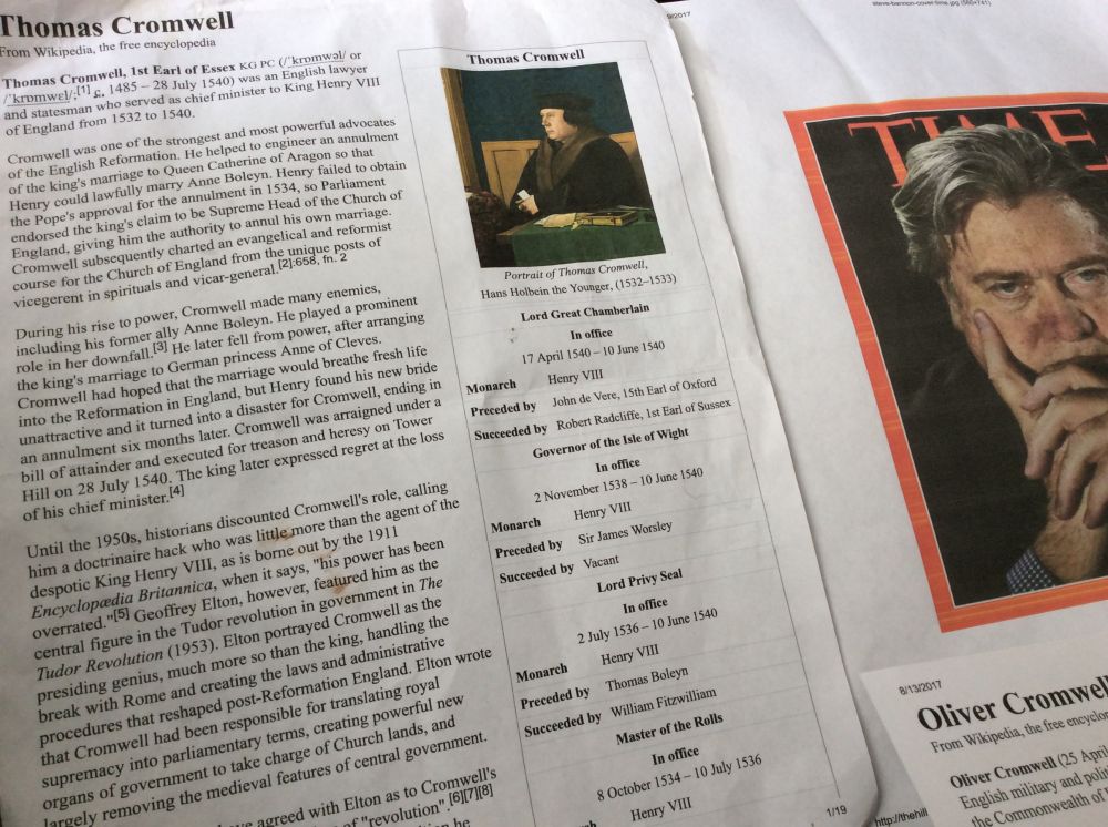 "影武者"史提夫·班农:把自己比作英国历史上帮助亨利·八世成就"伟业"的"国师"…汤马斯·克伦威尔,一位某种际遇,结局,类似秦王的商鞅,汉景帝的晁错生一——汤马斯,克伦威尔一一生于1485,,去世于1540而并非在之前一个回帖里的英国内战期清教徒领袖,"护国公"奥列弗·艾伦维尔…位生于1599,去世于1658,英国内战1642一-1651,十七世纪的克伦维尔,是"共和体制""议会制"的维护者,早他一百年的汤马斯·克伦威尔一一:是"一心意""活着,死了"都是为"成就""帝王之业"的"国师"…