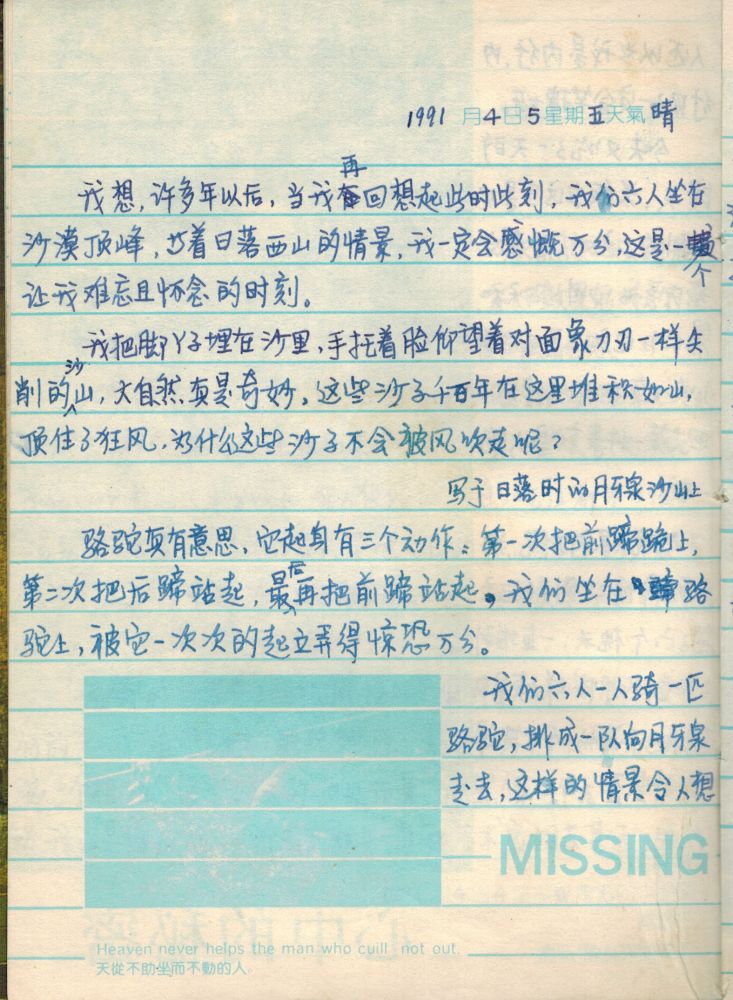 从出发的那天起一直到回到D 市的那天,我每天不管再累时间再晚,我都会充满激情地描述当天的所见所闻,遇到的有趣的事,有时候在火车上写,有时候在旅馆里写,有一次坐在沙漠顶峰等着日落的时候我都在写,因为我想写给峰看,我想要他看到这本游记时能和我旅行时感同身受。回到D市的时候,那本游记已经写了大半本了。