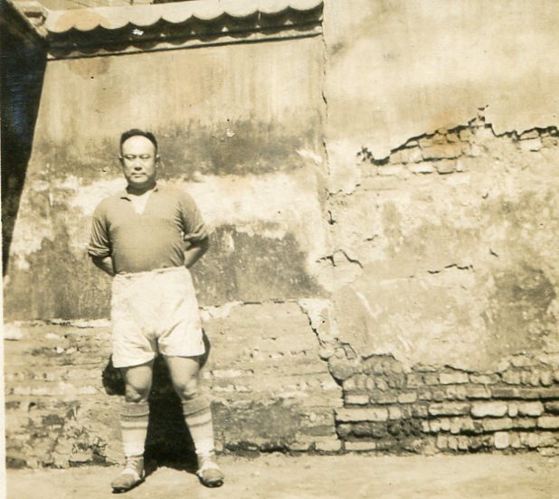 51年在北京东城的小破四合院里身着“利华”足球队队服(守门员)赛前留影