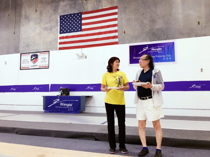 机遇就是缘分,自从王磊国际击剑俱乐部于今年3月21日成立以来,与栾菊杰教练见过三次面;第一次是俱乐部开张的那天,她是俱乐部的顾问,而且她出生的那年与我考进北京体育学院选择击剑专业学习是同年,俱乐部开张那天他还为小学员上了训练课,她给我的感觉是一位性格豪爽之人,执教认真热情,说话语速稍快,普通话里带有较浓的家乡(南京)口音;第二次见面是在7月初的全美击剑锦标赛时相遇,她带着加拿大自己的学员参加比赛,赛后便飞来新泽西州为王磊击剑俱乐部的暑期训练营上课,7月14日这天的上午俱乐部的沈教练打电话给我,让我中午时分到俱乐部有事情,当我到俱乐部才知道俱乐部给我的意外惊喜---庆生会,无独有偶的是栾菊杰教练也是7月14日的生日,而且,俱乐部还为我这位老学员开庆生会,真是让我感到高兴和意外,再次感谢俱乐部的负责人—沈教练及我的教练们,更有幸的是与我国击剑史上奥运首枚金牌得主---栾菊杰女士一起过生日,再一次感谢关心和帮助我的教练员及哄我一起玩剑的少年剑友们。今天晚上刚上完赵教练的训练课,正在擦汗就见栾菊杰走进练习场地,相互打招呼说了几句话我就去换衣服,当我回来收拾剑包时,她已经换好教练服开始上训练课了,他只是来参加明天(9月2号)俱乐部的OPEN HOUSE ,还抓紧时间给学员上课,由此可看栾菊杰教练对击剑事业的热爱与执着是值得我们这些击剑爱好者认真学习的。