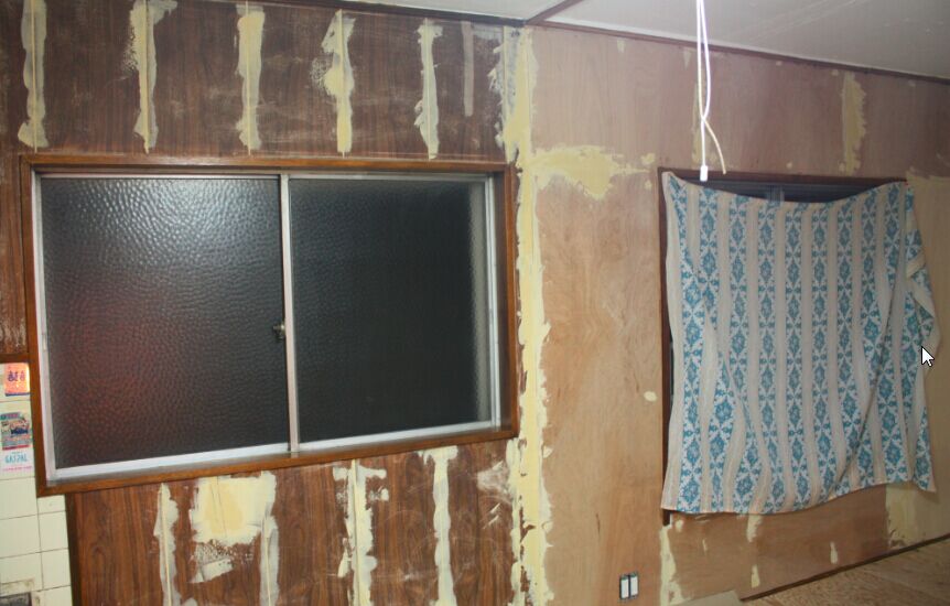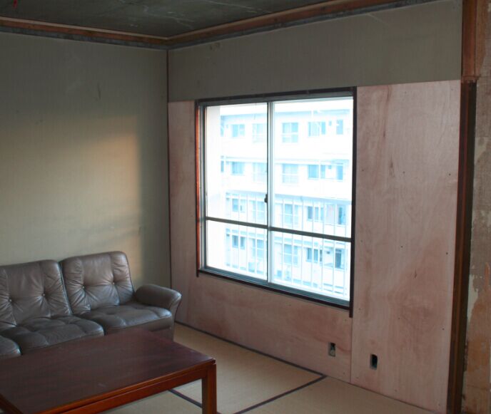 第三种是绿色的像刷了一层细沙一样的墙壁,这个在日本好像很常见,榻榻米的房间大都是这种。这种墙壁很硬里面是3厘米的水泥再里面是混凝土,表层好像刷了细小的沙子,凸凹不平,不适合直接贴壁纸。